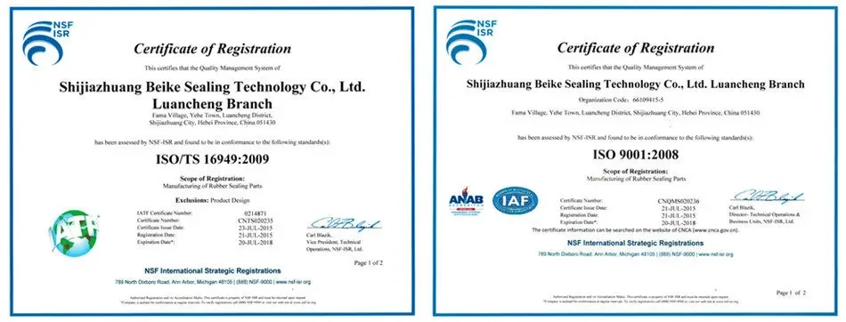 Shijiazhuang Beike Sealing Technology Co.,Ltd. specializes in rubber sealing field. We built one set of rubber vulcanization curve control system and introduction adva-ntaged rubber production line with testing equipment. Meanwhile a rubber products production quality control system was created according to ASTMD2000 standard . 1.supply oem&odm order,independent Q.C department ,3 times of quality checking, 2.100% percent of pass before shipping 3.IS09001 ,TS16949 certification 4.OEM services,free samples are available 5.Feedback: inquiries will be dealed with in 48h 6.After service :any question and issue,feel free to contact us 7.Craft: compreession mold 8.Free CNC machining center, strong ability of mold development and high speed of mold opening.